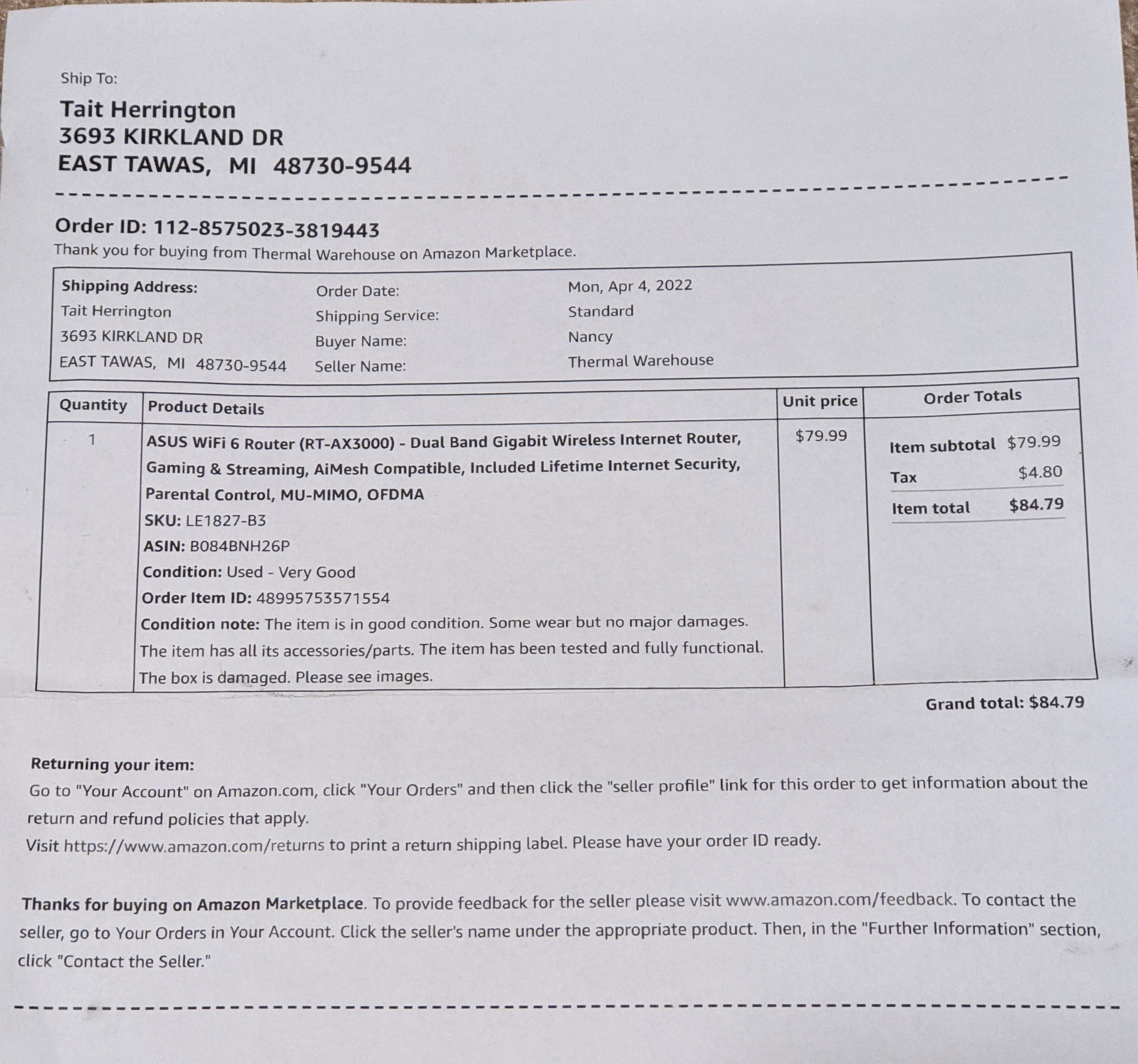 - He also included his invoice for this busted router he sent me which he purchased from Amazon (not from me).